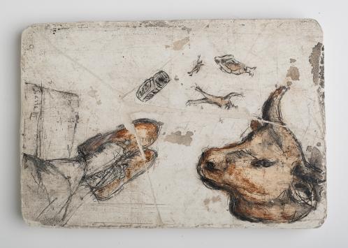 2002, Plâtre gravé, technique mixte , 20 x 23 x 1,5 cm