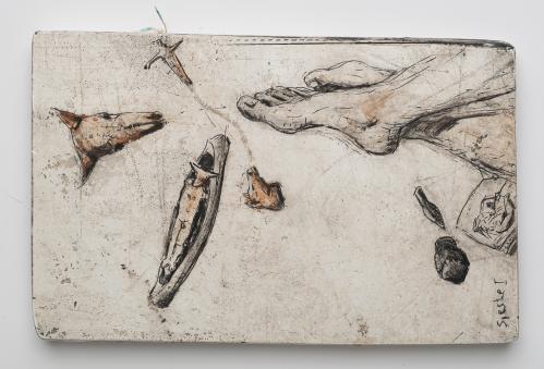2005, Plâtre gravé, technique mixte , 14,5 x 22,5 x 1 cm